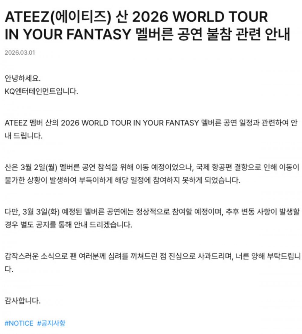 On March 1, KQ Entertainment released an official statement announcing that San had planned to travel to Melbourne to attend the March 2 (Monday) performance. However, unforeseen international flight cancellations have made it impossible for him to arrive in time, resulting in his unavoidable absence from the concert.