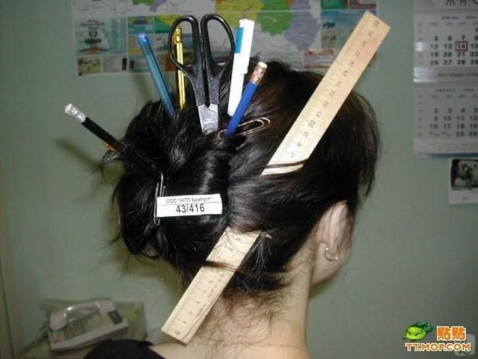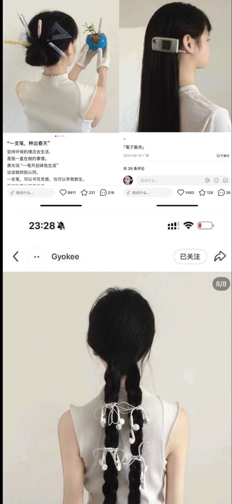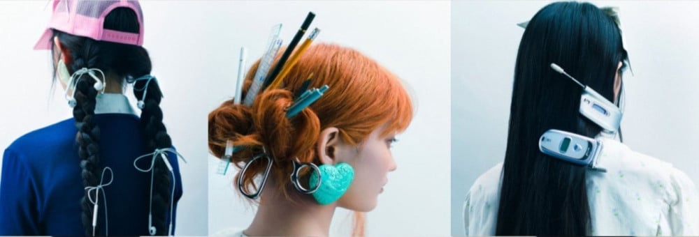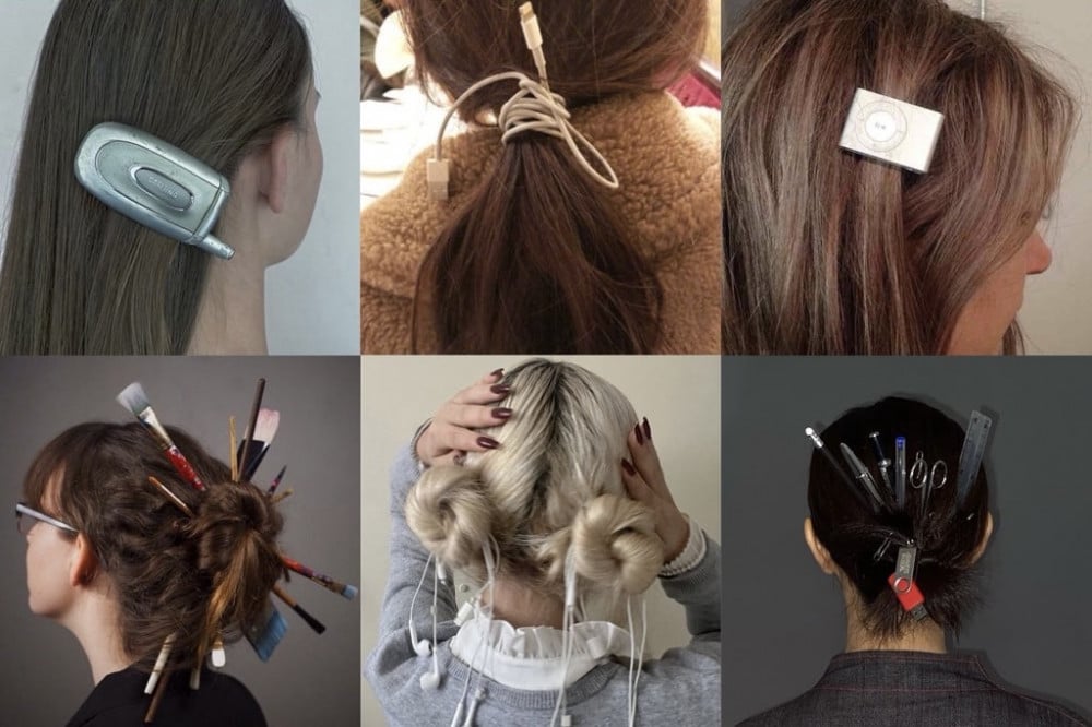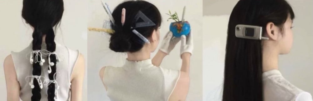 In one image, long dark braids have old school earbuds woven into them, closely resembling a similar style seen on Ali Express. In another, school supplies such as rulers and pens are placed in the hair, while silver flip phones are clipped onto long straight hair like accessories.