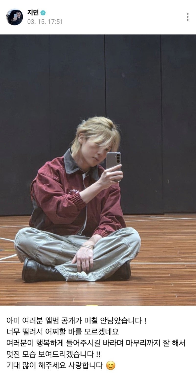 On March 15, Jimin greeted fans on the fan platform Weverse by sharing a mirror selfie taken in a practice room, offering a glimpse into how he has been doing lately.