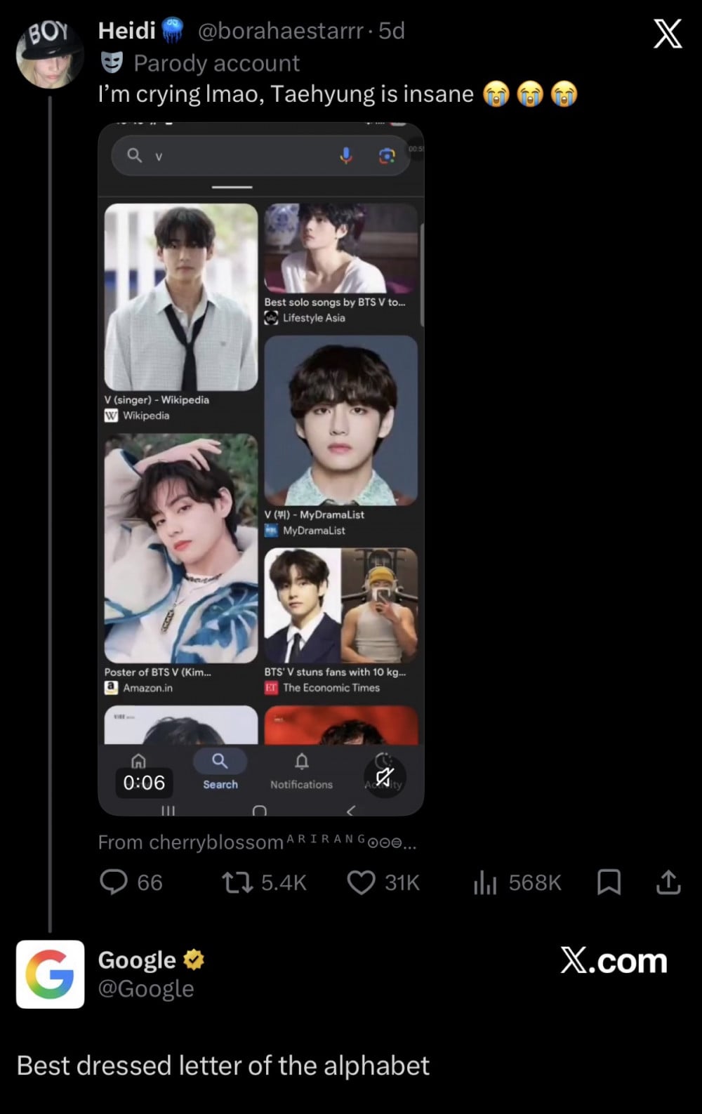 The moment gained further attention when the official Google X account responded playfully, describing V as the “best dressed letter of the alphabet,” referencing the BTS member’s well known visuals and style.