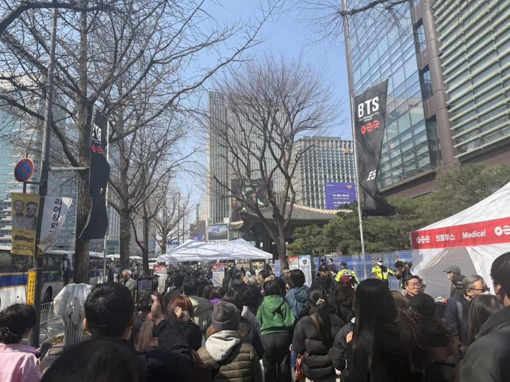 Meanwhile, the city of Seoul and the South Korean government is expected to spend far larger amounts in infrastructure and resources for the massive-scale public event, which will employ over 6,700 police officers and 3,400 safety officers to regulate traffic and safety measures. As of March 20 KST, anyone passing through Gwanghwamun Square, regardless of whether or not they intend on seeing the comeback show, must undergo body screenings as a precaution. It has also been pointed out that since the morning of March 20 KST, residents of the city of Seoul have received repeated disaster messages issued by the government on their mobile devices, notifying them of road closures and access restrictions around Gyeongbokgung.
