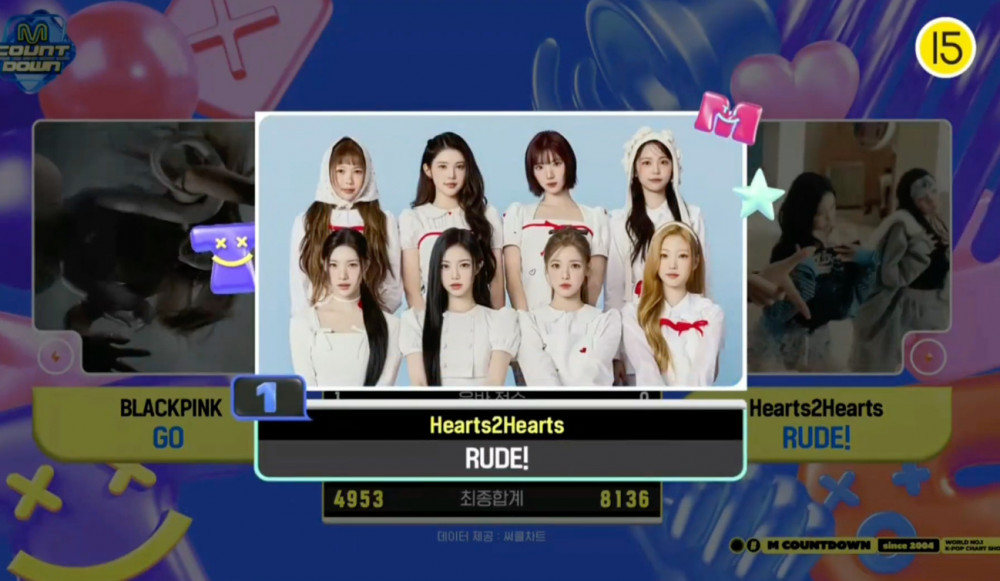 On the latest episode, the top spot came down to a close competition between BLACKPINK’s “GO” and Hearts2Hearts’ “RUDE!.” When the final scores were tallied, BLACKPINK earned 4,953 points, while Hearts2Hearts dominated with a total of 8,136 points, ultimately claiming the trophy.