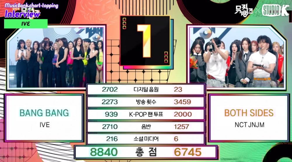 The candidates for first place on this week’s episode were IVE’s “BANG BANG” and NCT unit JNJM’s "BOTH SIDES." NCT unit JNJM finished in second place with 6,745 points, while IVE ultimately took the win with a total of 8,840 points, securing the No. 1 spot.