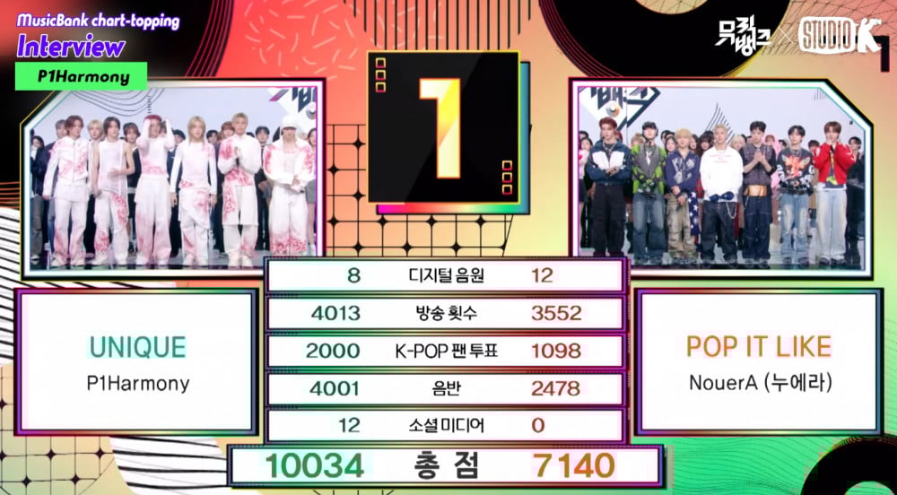 On the March 20 broadcast of 'Music Bank,' P1Harmony took first place with a total of 10,034 points for “UNIQUE,” surpassing NouerA’s “POP IT LIKE,” which scored 7,140 points.