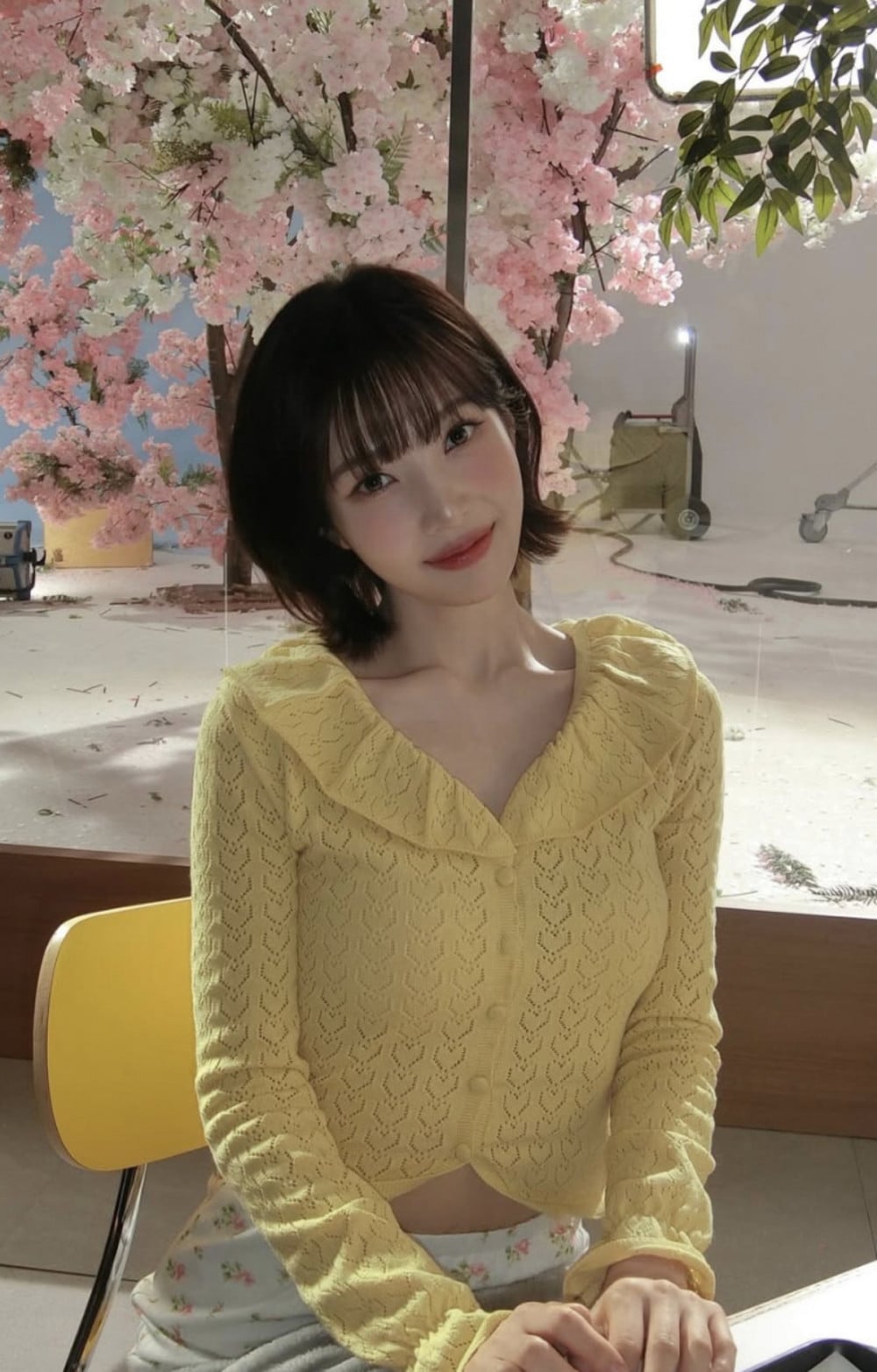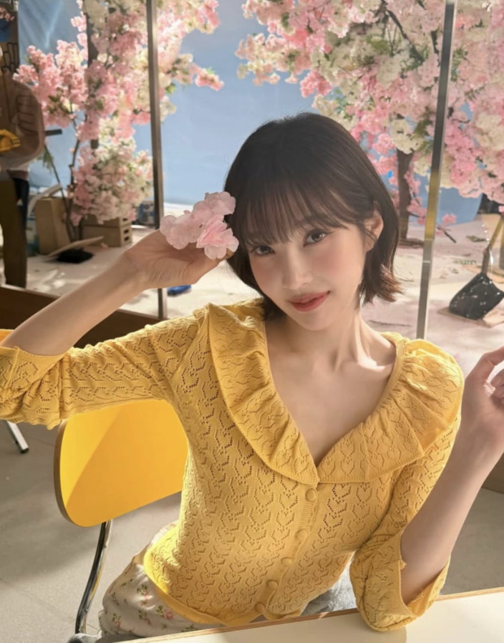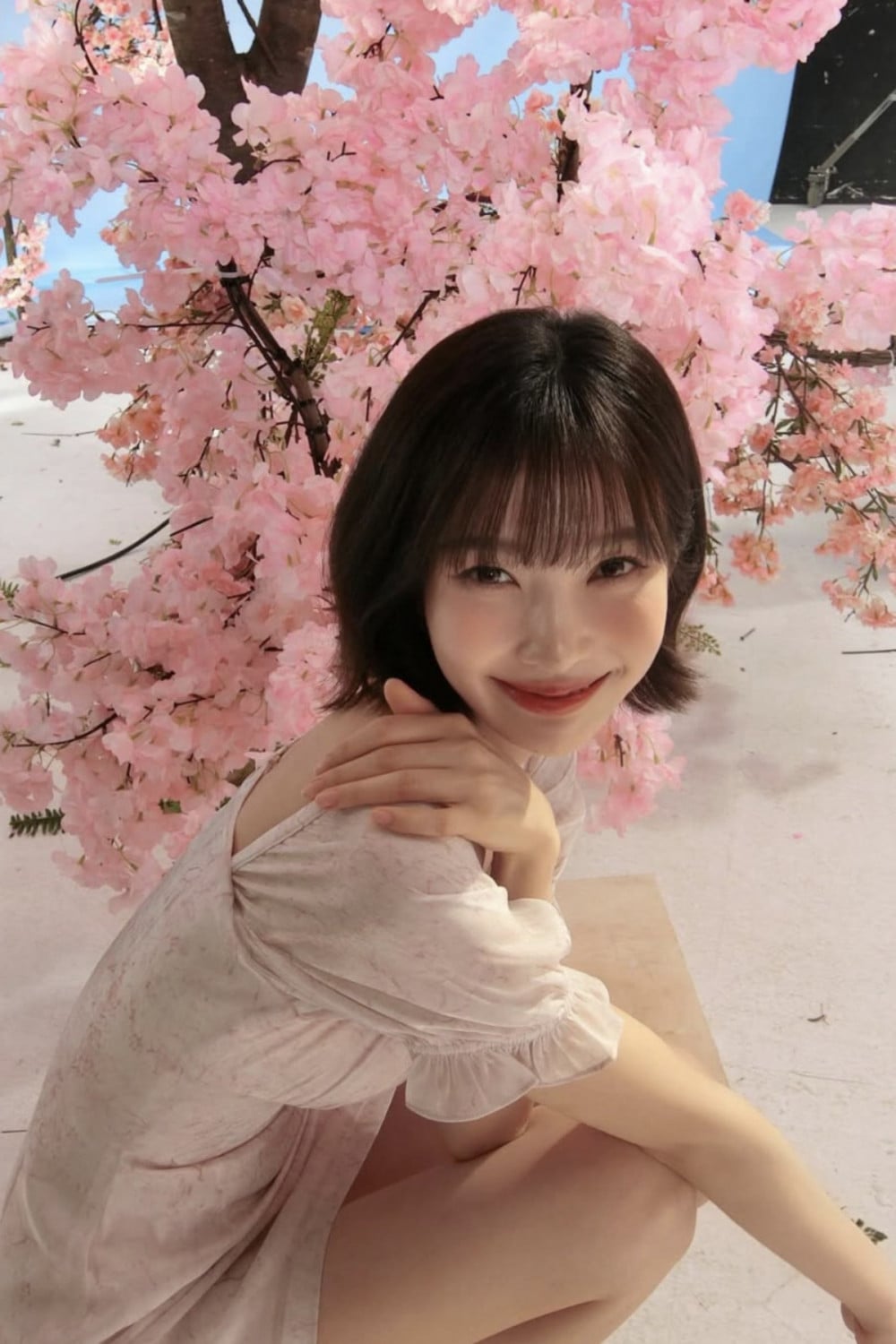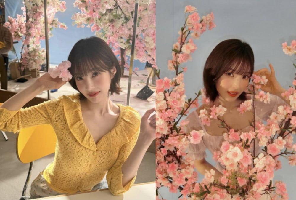 In the photos, Joy wears a yellow blouse decorated with heart patterns. In another shot, she appears in a pink dress with a flower tucked behind her ear, perfectly embodying the spirit of spring. With her clear facial features and radiant smile, Joy added a touch of lovely charm to the floral setting.