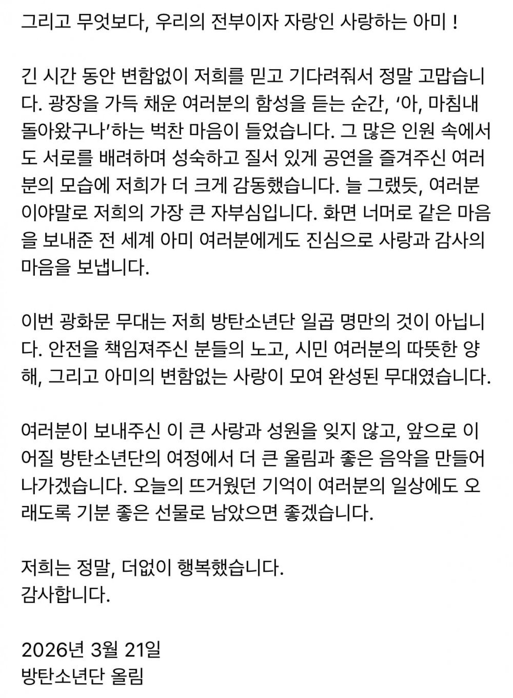 Thank you so much for believing in us and waiting for us with unchanging hearts for such a long time. The moment we heard your cheers filling the square, our hearts were overwhelmed with the thought, ‘Ah, we have finally returned.’ We were deeply moved by how you enjoyed the performance in a mature and orderly fashion, showing consideration for one another even within such a massive crowd. As always, you are our greatest source of pride. We also send our sincere love and gratitude to the ARMY around the world who shared this same heart with us from across their screens.