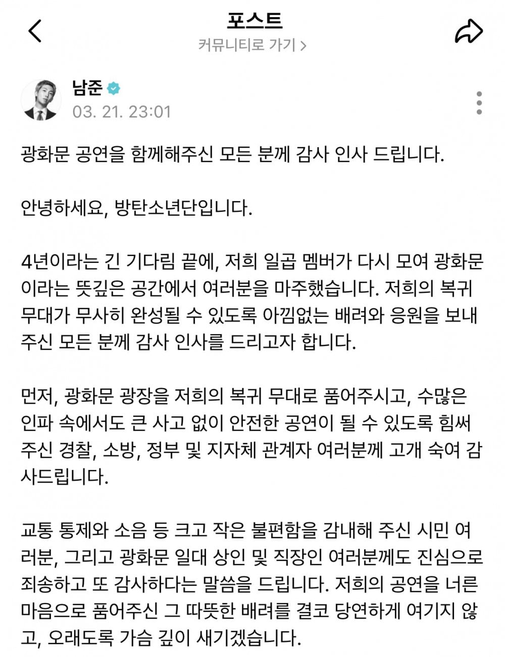 This Gwanghwamun stage did not belong to the seven of us alone. It was a performance made possible by the hard work of those responsible for our safety, the warm understanding of the citizens, and the unchanging love of ARMY.