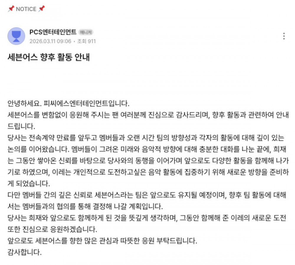 PCS Entertainment announced on March 11 via its official social media accounts, stating, “We would like to provide an update regarding Sevenus’ future activities. Ahead of the expiration of members’ contracts, we engaged in extensive discussions about the group’s direction and each member’s individual pursuits.”