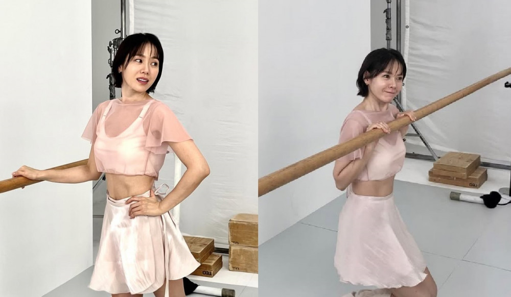 She pairs a luxurious rose gold satin innerwear set with a mini skirt and poses while holding onto a ballet barre. Her flawless figure instantly catches the eye, especially her clearly defined abs. In particular, her natural makeup, neat bob hairstyle, and healthy silhouette radiate a unique charm and further highlight her signature graceful image. Even after giving birth, her healthy beauty, maintained through consistent care, stands out.