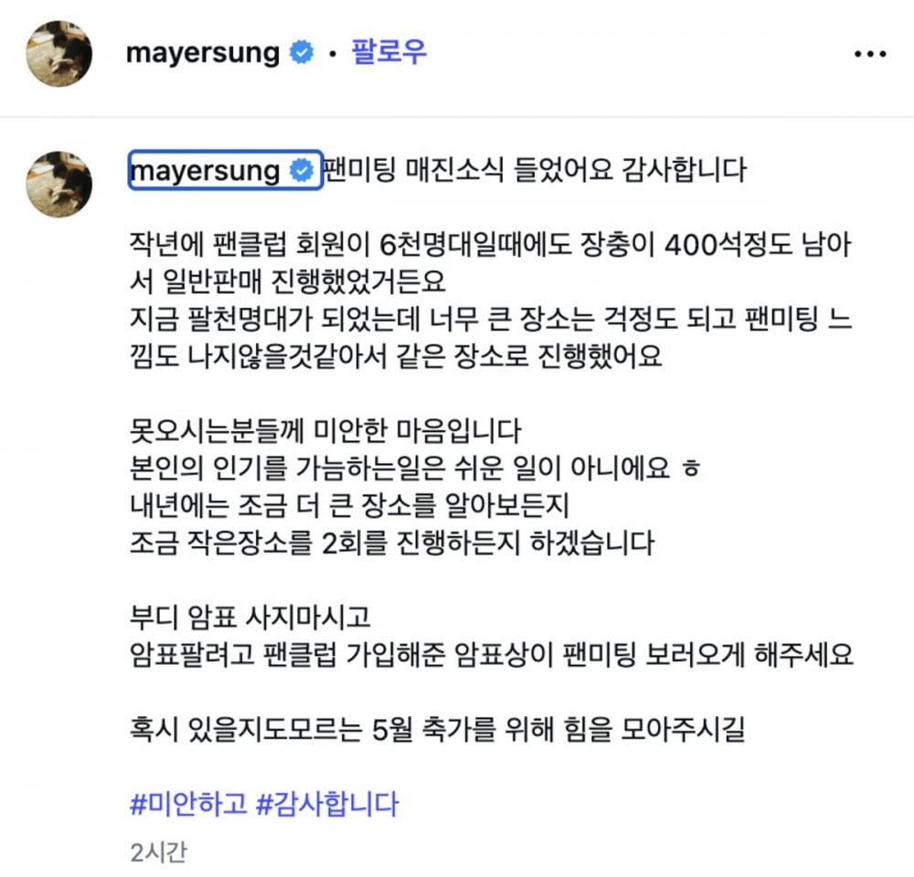 Sung also delivered a firm message regarding ticket scalping. “Please do not buy scalped tickets. Instead, let those scalpers who joined the fan club just to resell tickets end up attending the fan meeting themselves,” he said, asking fans not to support the illegal resale market.
