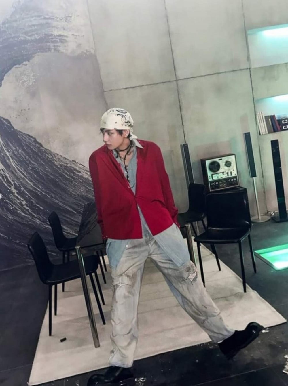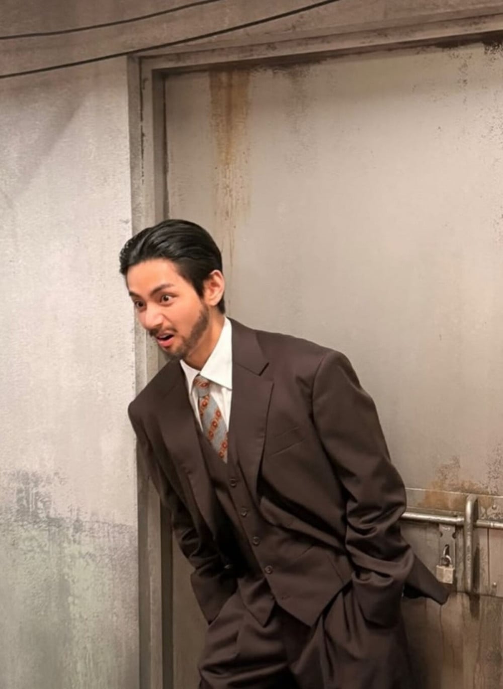In the first black-and-white photo, V wears a suit and a full beard, striking exaggerated expressions that give off a classic noir film vibe. Another photo shows him in flamboyant retro clothing, presenting a completely different charm.