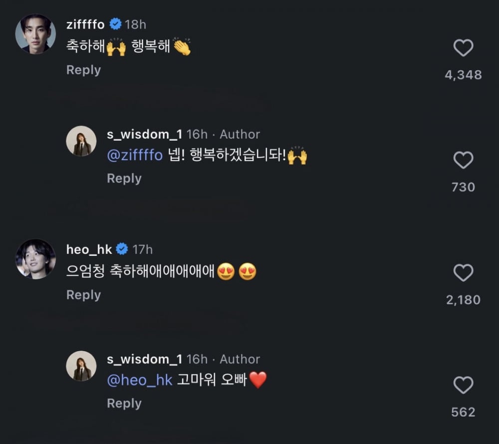 Song Ji Ho, who portrayed her on-screen husband in the series, added, “Congratulations, be happy,” drawing particular attention. Fans reacted playfully to his message, leaving comments such as “her ex-husband” and “nice to see the ex,” adding a lighthearted touch.