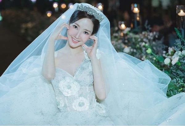 When a Joseon-era lady time-travels straight to the wedding venue of modern Seoul, the result is nothing short of magical. Dressed in a classic white gown with a graceful, voluminous skirt and delicately detailed bodice, Park Yeon-Woo’s bridal look radiated both purity and strength.