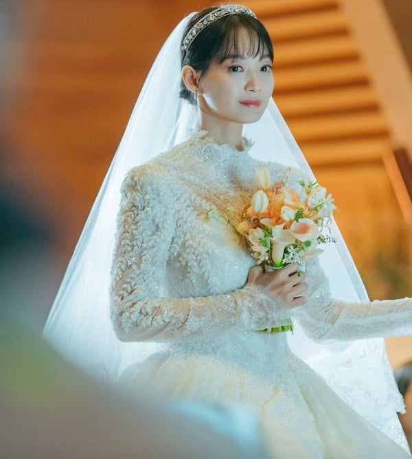 Even villains deserve their iconic moment, and Cheon Seo Jin delivered. Her dramatic wedding look matched her fierce, larger-than-life personality. With a gown that was as commanding as her presence, this was no ordinary bridal look; it was a statement.