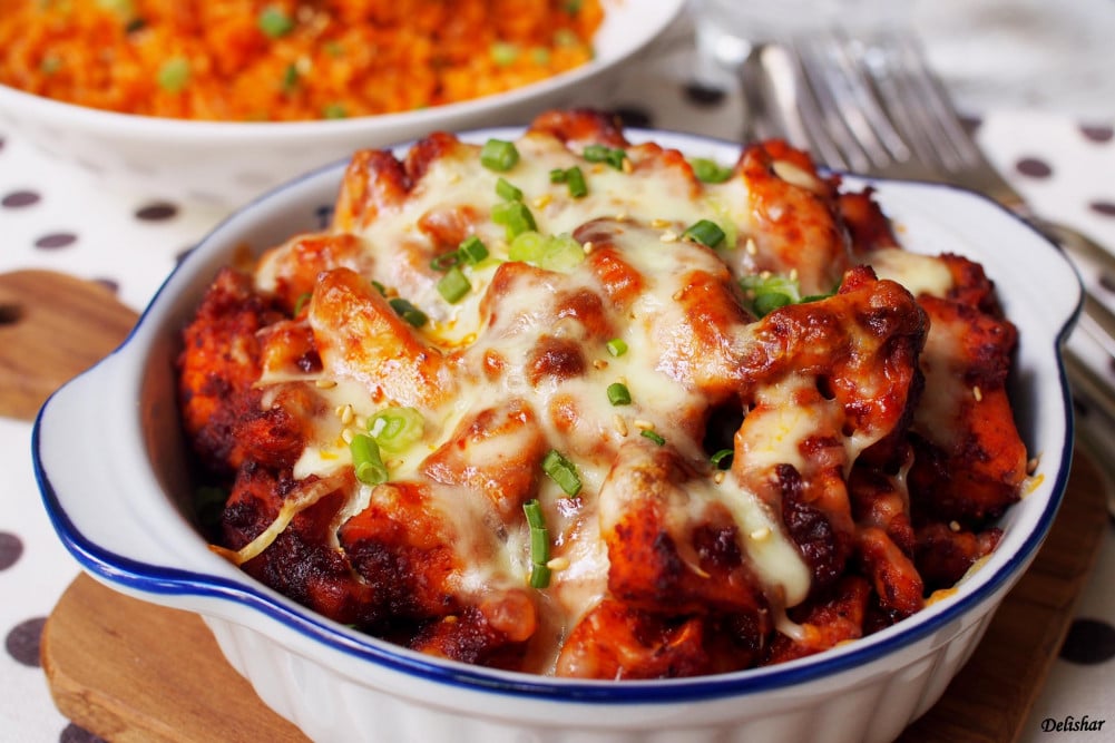 This dish doesn’t get its “fire chicken” name for nothing. Buldak features juicy grilled chicken coated in a fiery red sauce made from gochugaru, soy sauce, and sugar, then topped with melted mozzarella to balance the burn. It’s spicy, smoky, and satisfying. The kind of dish that dares you to take another bite even when your tongue’s on fire.