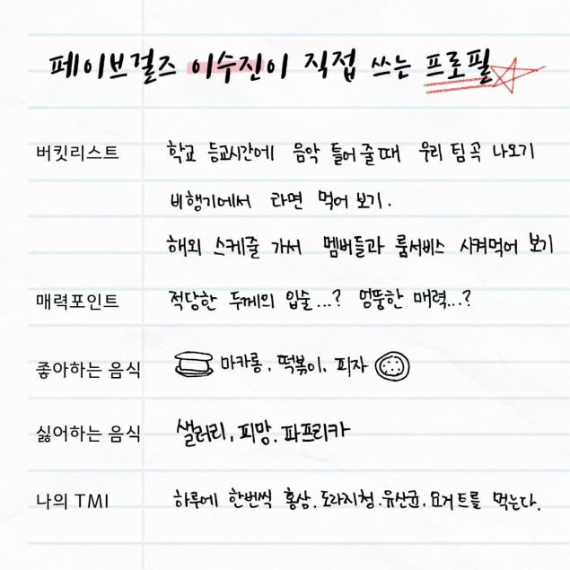 On October 28, Fave Entertainment released the hand-written member profile for Fave Girls member Lee Soo Jin. The translated information is as follows: