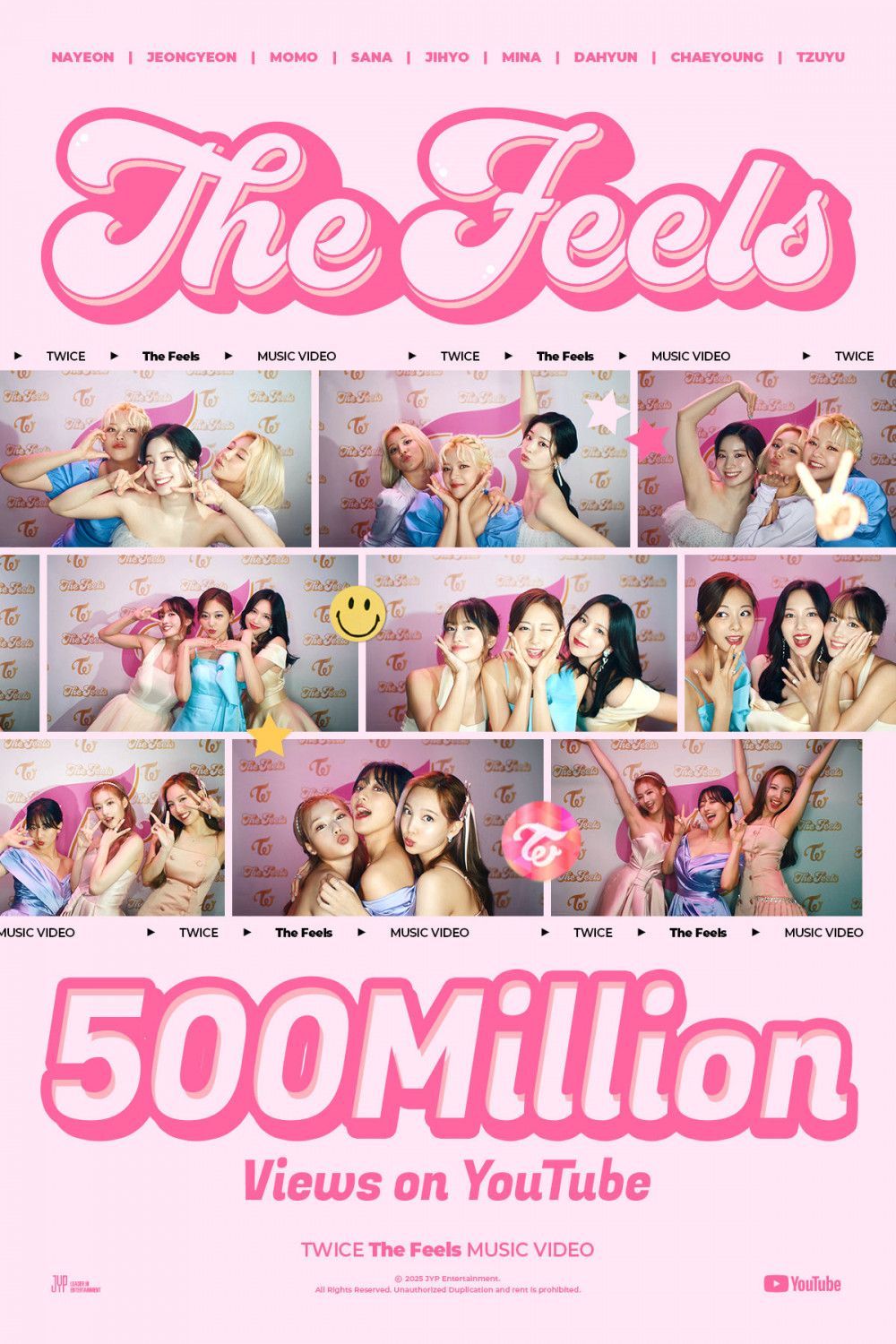 On October 21, the JYP Entertainment girl group's music video for "The Feels" soared past 500 million views on YouTube, becoming TWICE's 9th music video to do so after "I Can't Stop Me," "Feel Special," "Likey," "Fancy," "What Is Love?", "TT," "Cheer Up," and "Like Ooh-Ahh." The music video hit the mark approximately 4 years later.