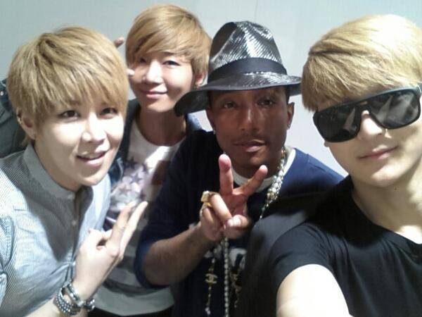 LEDApple snapped a picture recently with popular American artist, Pharrell! The picture was posted onto the official Twitter on May 14. In the picture, the boys look happy as they smile at the camera and Pharrell joins in the fun with his own V-sign!