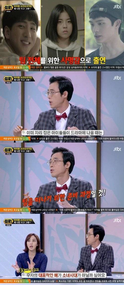 In regards to the discussion about idols appearing in dramas, MC Lee Yoon Suk analyzed, "There are a lot of cases in which [idols from] smaller agencies appear in cable dramas out of a sense of duty to raise up the group, but I think there are also a lot of cases in which top idols who had already established themselves appear in dramas to start preparing to leave the group."
