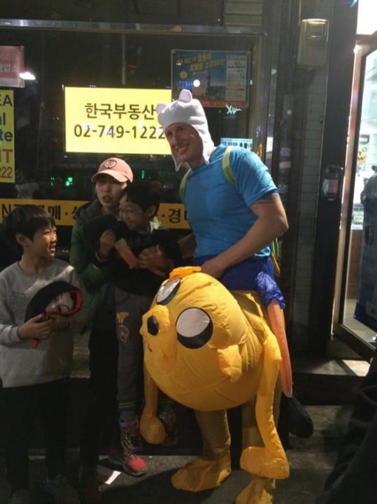Itaewon on October 31, 2014, lined with fall trees, decorations, and Halloween hooligans.