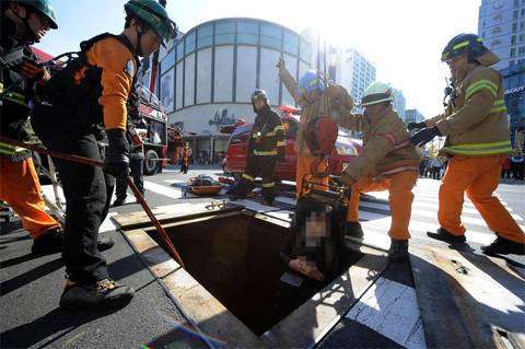 The incident occurred in the city of Suwon at a crosswalk near the Suwon City Hall Station. While the woman was walking across the street, she suddenly fell through a manhole that had been covered by iron plates. The woman has been taken to a hospital since and is reported to have suffered a wound to her backside. Netizens have commented that it is a relief that she wasn't injured anymore severely, as the accident could have endangered her life.
