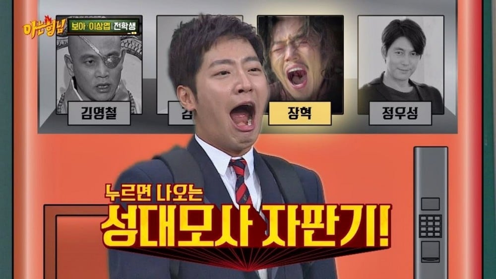 During the early part of the show, Lee Sang Yup expressed how much he wanted to meet Super Junior's Heechul because he too, is very good at impersonations. With the suggestion from the cast, the two stars got into an impersonation battle where they tried to copy voices from several celebrities. The two even challenged 'Knowing Brothers' cast member Lee Sang Min in a 'Hidden Singer' style. Check out both video clip below!