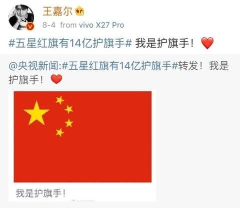 Recently, in response to Hong Kong protesters chucking the Chinese flag into the sea, China’s state-owned news outlet, CCTV wrote on Weibo, “China’s national flag has 1.4 billion flag bearers. I am a flag bearer.”