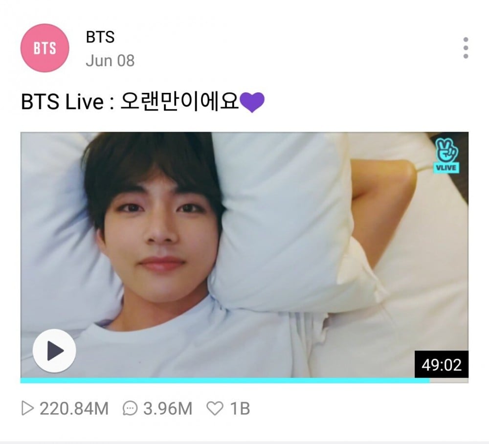 It's been a handful of days since BTS V’s VLIVE became “Fastest to reach 200M views”, it already has set another standard record for others to follow. Trend setter V’s Vlive from June has become Fastest to reach 1B hearts of 2019 in almost 4 months.(till date)