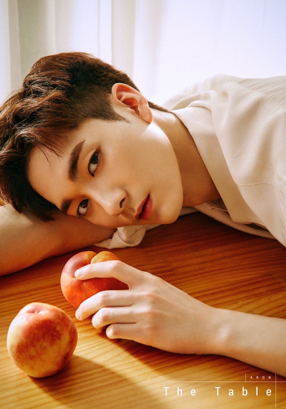 In his teaser image, Aron lays on a wooden table with a fruit in his hand. As previously reported, NU'EST asked fans to send in their own love stories for their 7th mini album 'The Table', and fans can expect those stories to be incorporated into the group's comeback.