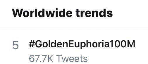 Jungkook breaks yet another record as the first Male idol in a group to achieve the whopping number of 100M streams on Spotify , that too with an unpromoted bside! Euphoria is currently the third most streamed song by a Korean soloist on Spotify and the longest charting song by male idol on BB World digital song sales. Its achieved critical acclaim and is a favourite among celebs. It was also played as a soundtrack in HBO's Euphoria finale and has over 1M unique listeners on the South Korean streaming platform Genie. Euphoria is currently the most successful bts song chart wise. #GoldenEuphoria100m trends worldwide at no 5 and two tags congratulating Jungkook trend at no 2 and 4 in Korea.