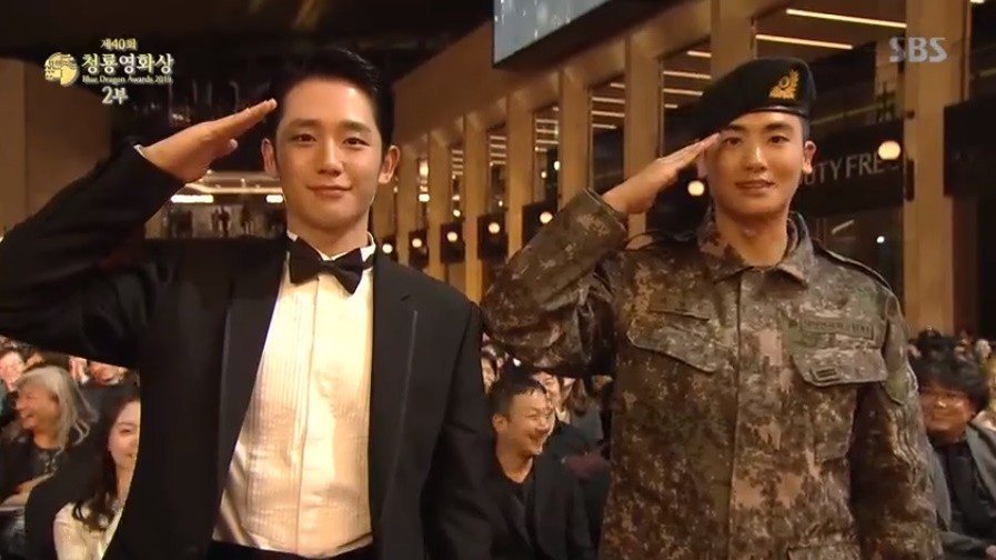 In fact, during the award ceremony, Hyungsik was called on by MC Park Kyung Lim to greet viewers for the first time in a while. Surprised, Hyungsik stood up, and along with actor Jung Hae In who happened to be sitting next to him, he gave a stern military salute.