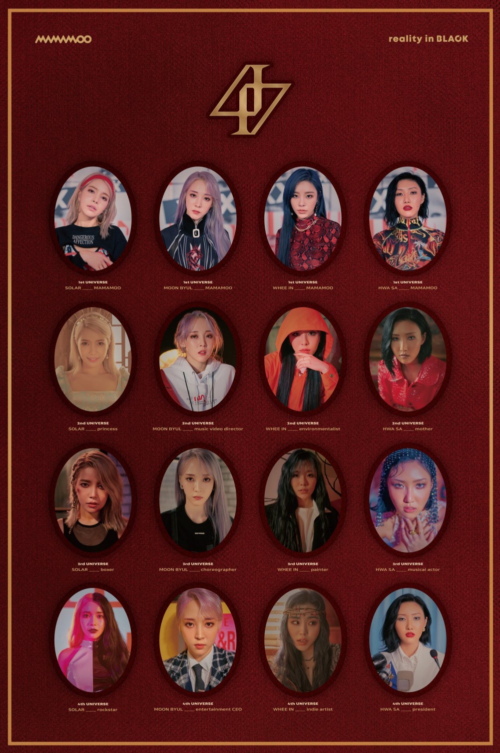 On November 11 KST, the group revealed a special teaser that imagines the type of women the members would be in alternate dimensions where there is no MAMAMOO. In the image, Solar assumes the roles of a princess, a boxer, and a rockstar, Moon Byul is a music video editor, choreographer, and an entertainment CEO, Whee In is an environmentalist, a painter, and an indie artist, and Hwa Sa is a mother, a musical actor, and a president.