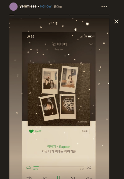In the Instagram Story series, Yeri can be seen listening to: "Story" by Ragoon (which Yeri took part in composing and writing); "Hair in the Air" by Yeri, Renjun, Jaemin, and Jeno; "Tuesday is Better Than Monday" by Giant Pink feat. Yeri; and finally, "Dear Diary" by Yeri.