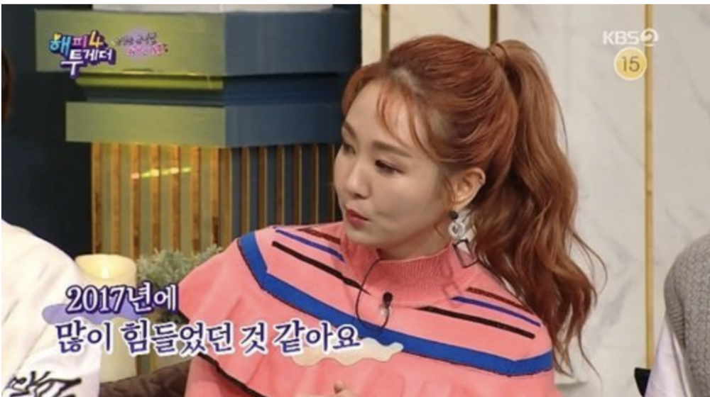 The entertainer appeared on the January 2nd broadcast of KBS's 'Happy Together 4' where she stated: "In 2017, I was in a situation where I couldn't meet people or be comforted so I was digging my own. I made a lot of negative thoughts. I was wrapped up in thoughts of failure."