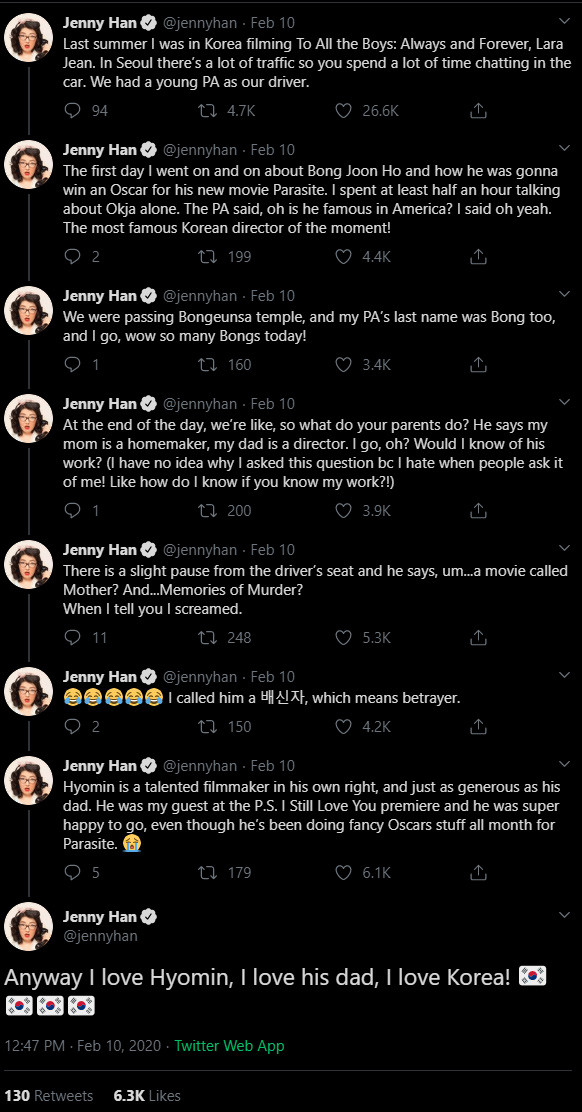 NY Times best-selling author Jenny Han recounted her hilarious first encounter with Bong Joon Ho's son, Bong Hyo Min.