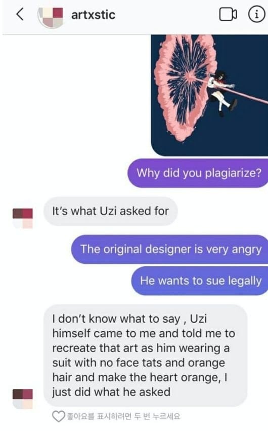 Tae Tae then shared a screenshot of a conversation that he had with the "That Way" cover designer that reads as follows. He also stated that he and his brother are looking for a lawyer, and wishes that the conclusion will help protect other artists from having their work stolen from in the future.