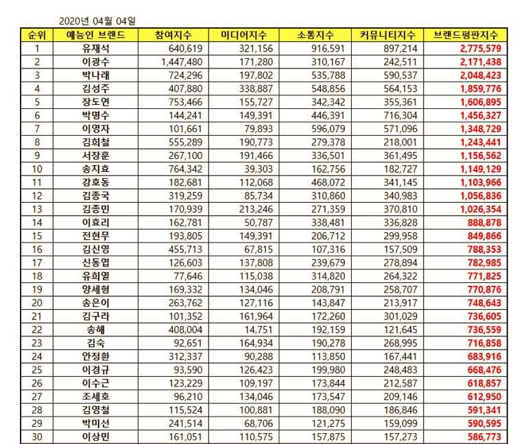 From March 3 through April 3, 2020, the Institute analyzed big data of 50 TV variety stars including in participation, media activity, communication, community activity, etc. In 1st place, Yoo Jae Suk raked in a total of 2,775,579 points, while 2nd place Lee Kwang Soo earned a total of 2,171,438 points. 3rd place went to comedian Park Na Rae with a total of 2,048,423 points.