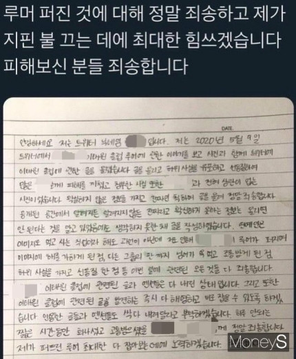 The Twitter user claimed that last month during the late hours of April 25, a top idol group member 'A' and another top idol group member 'B' spent time at a bar in Itaewon. After the news made headlines, the Twitter user posted a handwritten apology about spreading false rumors. The apology states that the idol member 'A' had no role in the story and that they were sorry for causing harm due to their false story.