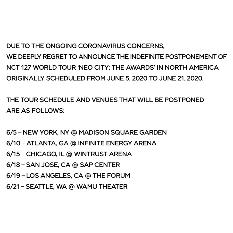 On May 15, Dream Maker Entertainment announced the official postponement of NCT 127's 2020 tour, 'Neo City: The Awards' in North America.