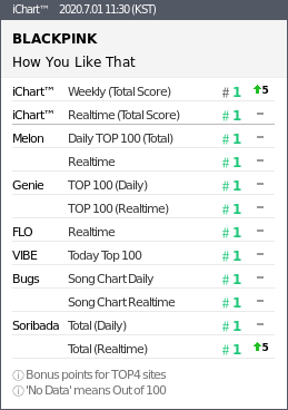 Approximately 4-days after its release back on June 26 at 6 PM KST, BLACKPINK's "How You Like That" has now topped all 6 major domestic realtime and daily music charts including Melon, Genie, FLO, VIBE, Bugs, and Soribada. As a result, the single is now #1 on both the realtime and weekly iChart!