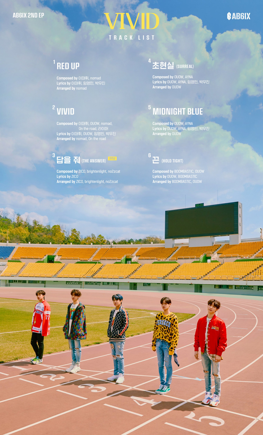According to the rookie boy group's newly revealed tracklist below, AB6IX's 2nd mini album is set to contain a total of 6 new tracks, including "Red Up", "Vivid", title track "The Answer", "Surreal", "Midnight Blue", and "Hold Tight". The tracklist also indicates that Lee Dae Hwi participated in composing and writing the lyrics for several of the tracks. Furthermore, AB6IX's comeback title track "The Answer" is composed and written by star idol-turned producer Block B's Zico.