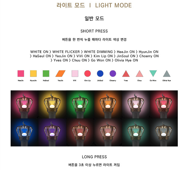 The lightstick is extremely elegant and has a powerful crown with a crescent moon on top. The crown is gold, which seems to be the official color that represents Orbit. The lightstick is also unique because it can change into the colors that represent all 12 girls.