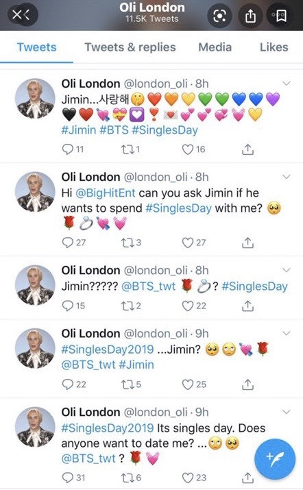 Another thought; BTS ARMY have called out Oli London multiple times (throughout 3 years) for using Jimin and BTS, like why has Big Hit Entertainment not blackmailed him yet for defamation? Like for heaven's sake- Oli went crazy to write on google that he’s married to Jimin and “marry” a cardboard cutout of Jimin. On the screenshot shown below, he harrasses BTS’s twitter with many posts. Oli has even exposed himself sending press release and in the past, a journalist from the Korean Herald called Oli out on twitter calling him delusional. " Oli London is delusional thinking he is a celebrity when he is a social media laugh clown."