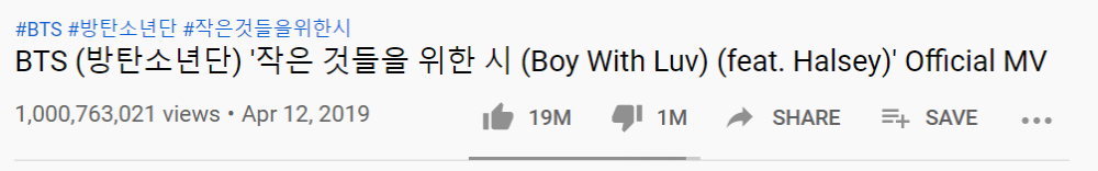 The music video for BTS' hit song "Boy With Luv", featuring Halsey, has surpassed 1 billion views on YouTube. This marks the group's second music video to hit 1 billion views following the music video for "DNA", which hit 1.1 billion views back on October 5th.