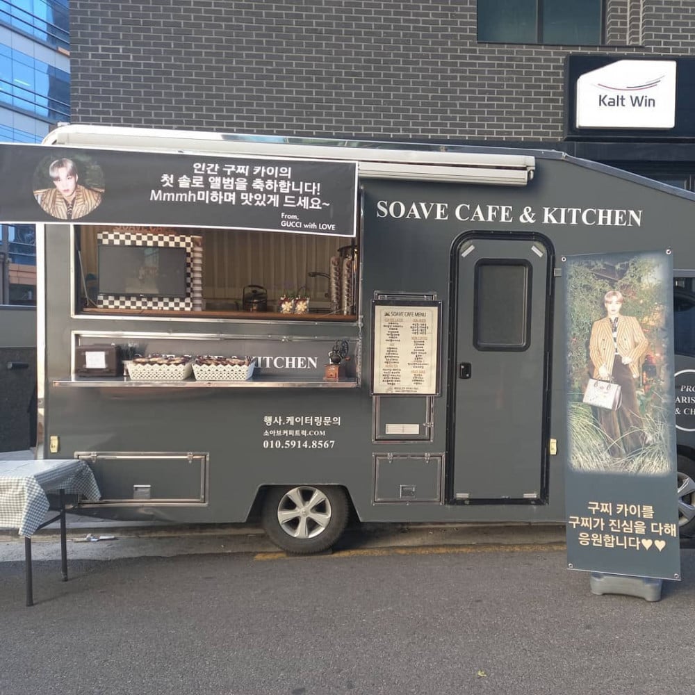 A coffee cart catering service recently revealed that 'Gucci Korea' sent a truck loaded with beverages, cookies, and more to EXO's Kai, celebrating the release of his solo debut album! As you can see below, the banner displayed in front of the cart reads, "Congratulations to the 'human Gucci' Kai for releasing his first solo album! Please enjoy and say 'Mmmh'~ From, Gucci with Love."
