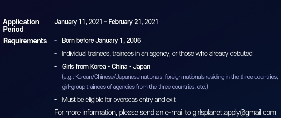 It will be tv show featuring female contestants with a minimum age of 16 from South Korea, China, and Japan, and also for all foreign trainees which are living in one of the three mentioned countries.