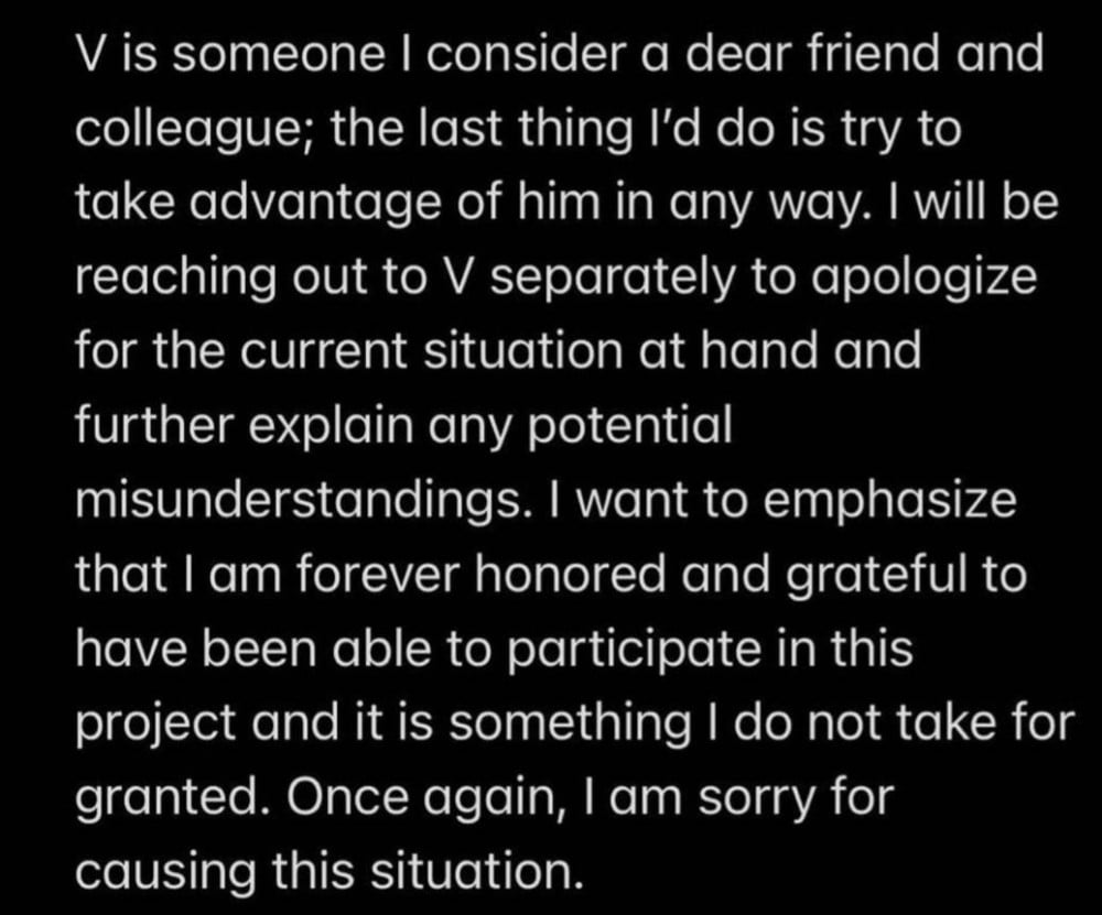 Shortly after the show, BTS fans pointed out him singing the song after being introduced as an original composer is disrespectful to both V and his work. Subsequently, he issued an apology on his personal Instagram which is shown below.