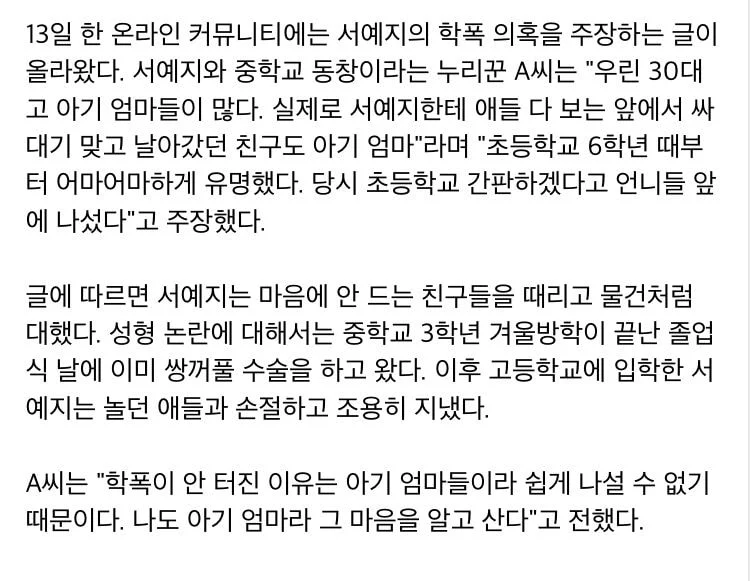 Various other accounts of Seo Ye Ji's school bullying have been compiled and shared in an online community. The writer of the post summarized the claims and explained, "Seo Ye Ji was once accused of being a school bully ever since her debut, but then her fans said it wasn't her because her face was different. When her schoolmates said it is Seo Ye Ji, the fans would shield her, so the allegations disappeared. Now the Kim Jung Hyun incident happened. Now, the school bullying allegations are surfacing again. The schoolmates are saying that her face is different because Seo Ye Ji got plastic surgery. The school bullying issue is disappearing again because more people are talking about her looks."