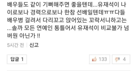 The netizen who created the post also uploaded other netizens' reactions as they criticized the arrogance of the actors and pointed out the difference between the actors' reactions toward the grand prize winners. The netizen who wrote the post also wrote, "It's the same grand prize but the reactions are so different. Most of the actors at the award show are probably Yoo Jae Suk's juniors. They should've stood for both winners or just sat for both. I guess all the actors are suffering from actor's sickness (the tendency for actors to think they are better than entertainers such as MC's)."