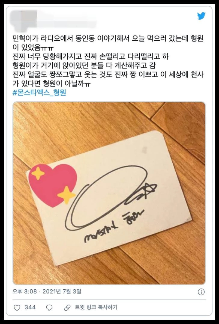 On Twitter, several fans of MONSTA X revealed that they met Hyungwon by chance at a restaurant that was recommended by Minhyuk on the radio. When they realized that Hyungwon was sitting at a table next to them, the fans were ecstatic and said that their hands were "shaking".